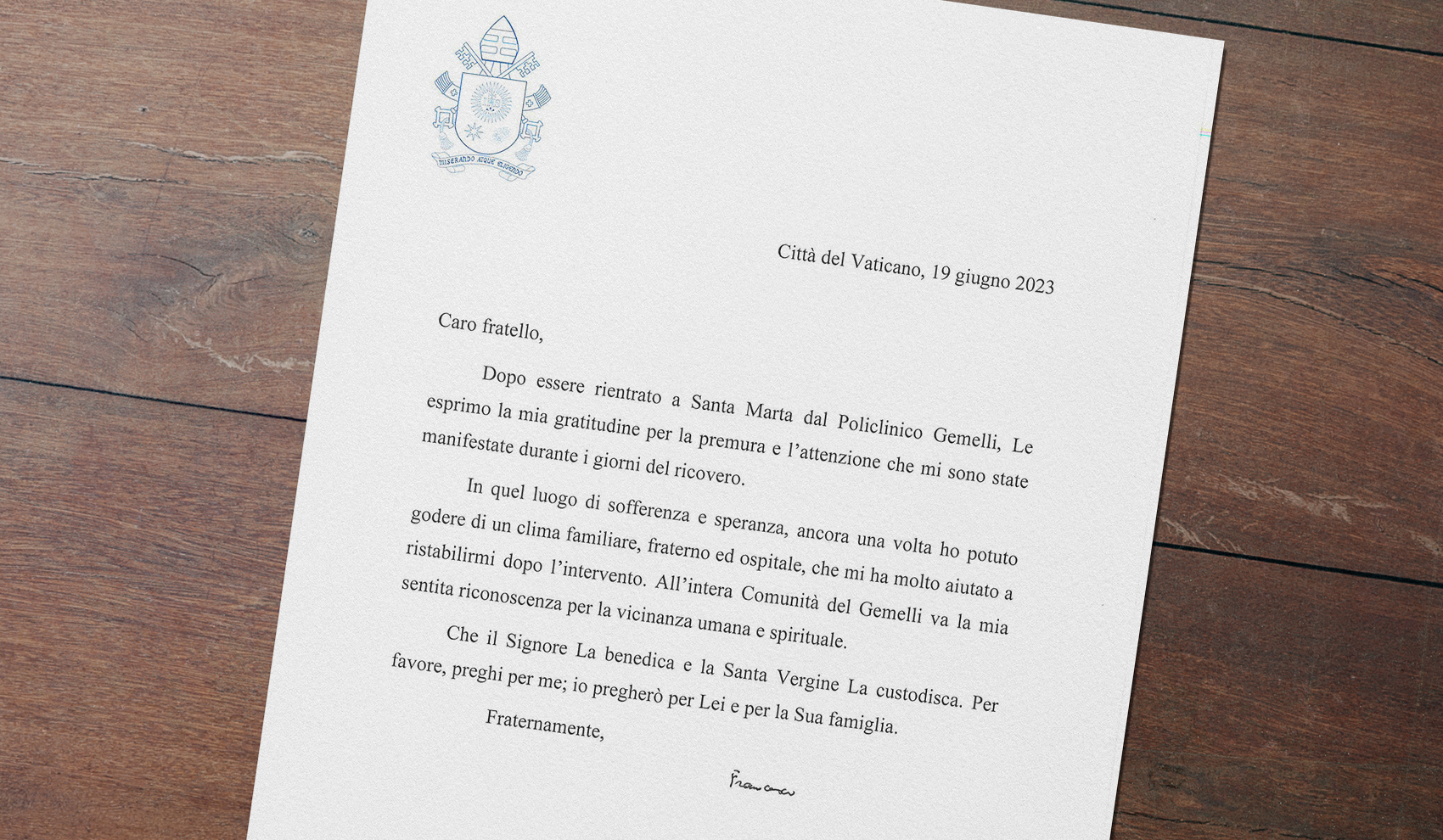 dobbiamo e vogliamo condividere con tutti Voi la gioia e la commozione per le parole del Santo Padre, che ha voluto così esprimere la sua gratitudine per la premura e l’attenzione manifestata durante i giorni del ricovero: “In quel luogo di sofferenza e speranza, ancora una volta ho potuto godere di un clima familiare, fraterno e ospitale, che mi ha molto aiutato a ristabilirmi dopo l’intervento. All’intera Comunità del Gemelli va la mia sentita riconoscenza per la vicinanza umana e spirituale”.