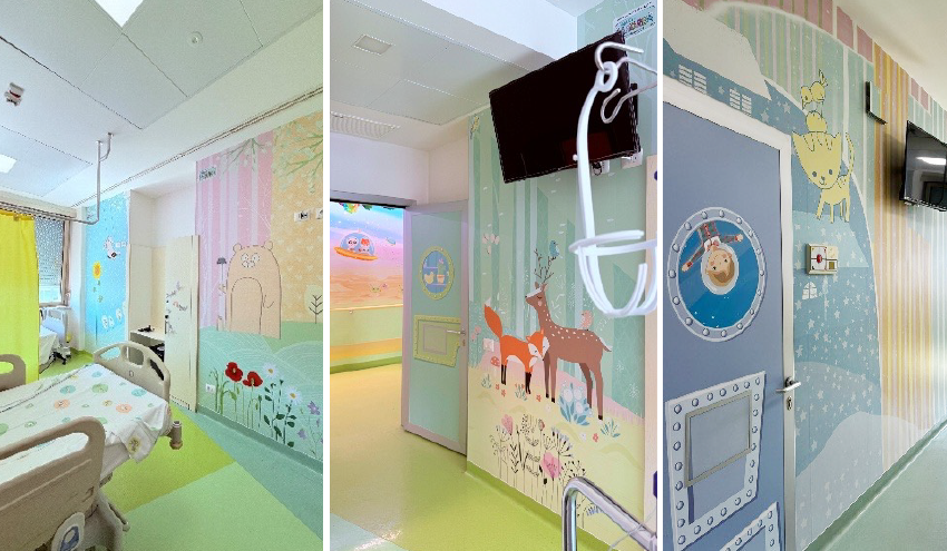 La sensazione di immergersi non in un ambiente ospedaliero ma in una fiaba, ispirata dal corridoio del reparto e dagli spazi del Day Hospital, prosegue ora nelle stanze in cui i piccoli pazienti e le loro famiglie trascorrono una parte importante del loro tempo.