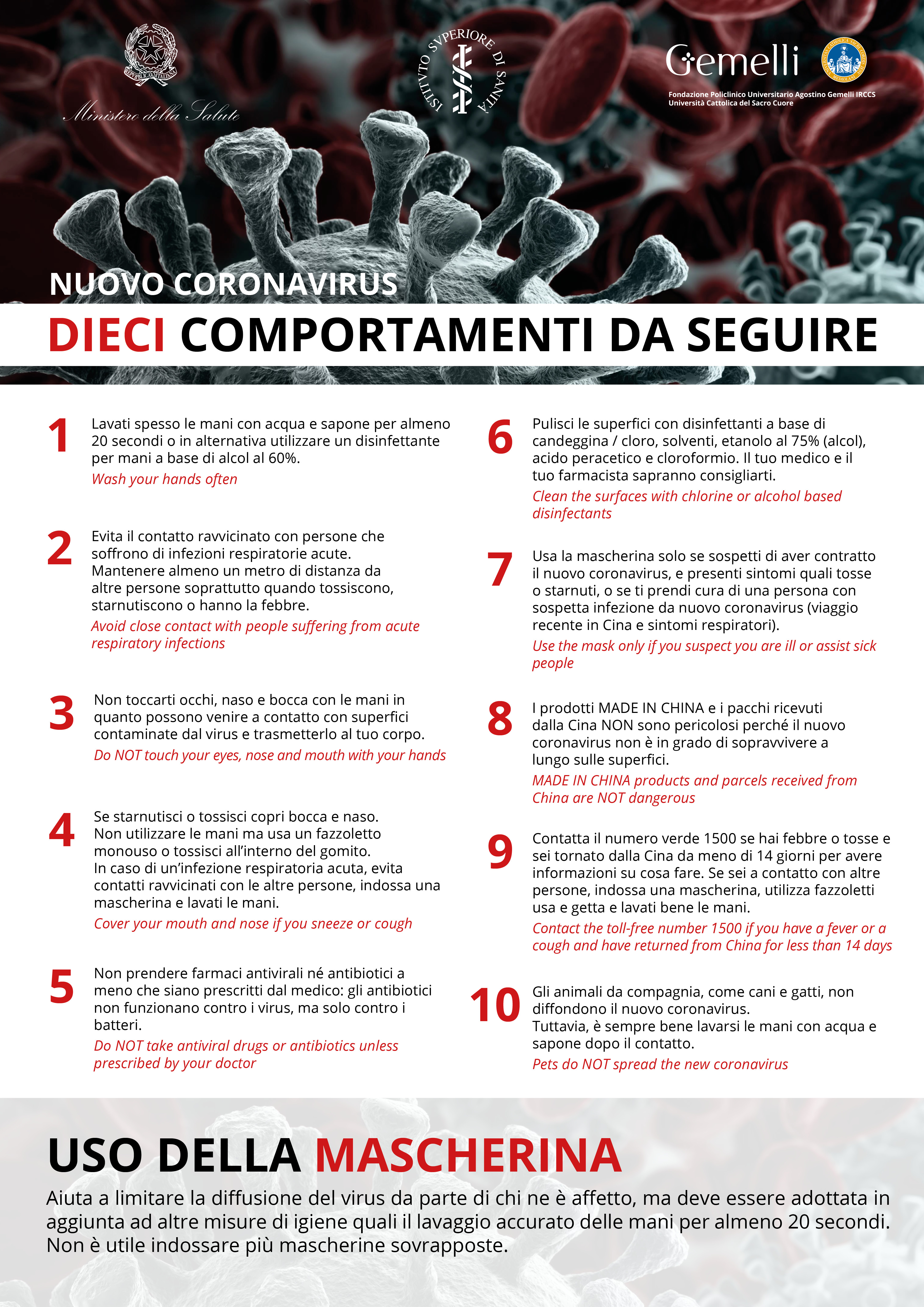 Contatta il numero verde 1500 se hai febbre o tosse e sei tornato dalla Cina da meno di 14 giorni per avere informazioni su cosa fare. Se sei a contatto con altre persone, indossa una mascherina, utilizza fazzoletti usa e getta e lavati bene le mani.Contact the toll-free number 1500 if you have a fever or a cough and have returned from China for less than 14 days