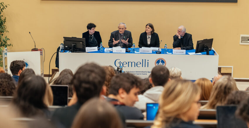 Alla presenza della Rettrice dell’Università Cattolica del Sacro Cuore Elena Beccalli, dall’Assistente Ecclesiastico generale dell’Ateneo S. E. Mons. Claudio Giuliodori, dal Preside della Facoltà di Medicina e chirurgia Alessandro Sgambato, del Direttore Scientifico della Fondazione Policlinico Universitario Agostino Gemelli IRCCS Antonio Gasbarrini, del Direttore della Sede di Roma dell’Ateneo Lorenzo Cecchi e di Marcello Candelli, coordinatore medico presso il Pronto Soccorso del Policlinico Gemelli, il Cardinale Zuppi ha intessuto con i ragazzi un dialogo fatto di ascolto e confronto sui temi della solidarietà, del farsi accanto, del tocco e dello sguardo verso tutti i più fragili.
