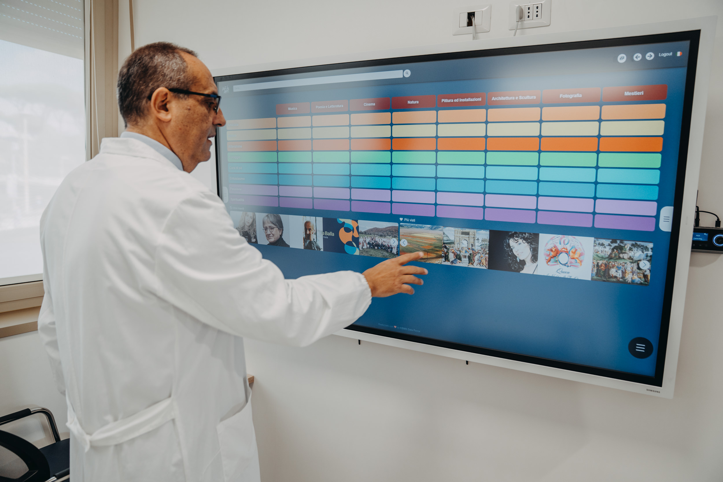 Ogni spazio è dotato di display interattivi, per la visione di contenuti motivazionali e artistici, inclusi video realizzati in collaborazione con il Museo MAXXI, con l’obiettivo di migliorare la resilienza dei pazienti. Presente anche una stanza cinema dedicata, per esperienze immersive collettive, e una stanza colloqui con sistema multimediale interattivo, pensata per migliorare la comunicazione medico-paziente.