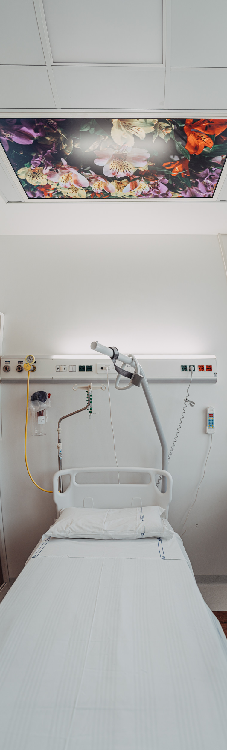 L’ingresso nel reparto diventa un invito a un cammino condiviso grazie all’installazione statica che accoglie il paziente sul tema dell’acqua, come elemento visivo e simbolico.
