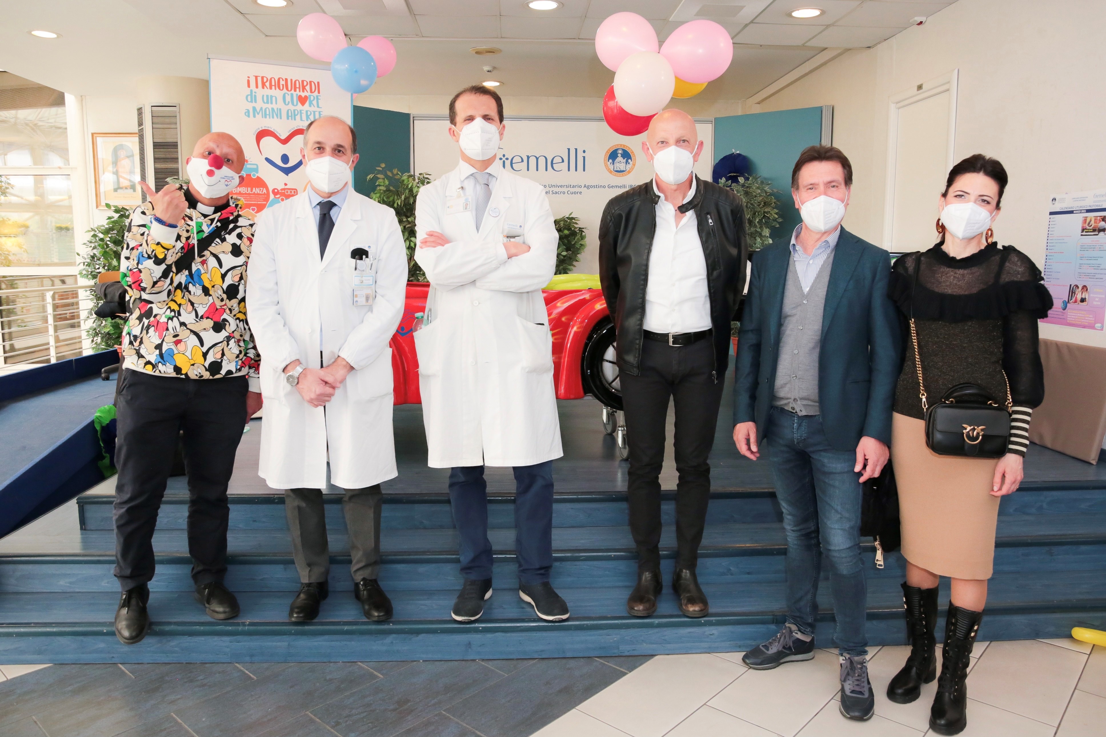La cerimonia di consegna dell’ausilio, simpaticamente ribattezzato “ludobarella car”, si è tenuta oggi, martedì 27 aprile, nella hall Policlinico Gemelli, alla presenza del professor Gianpiero Tamburrini, Direttore dell’UOC Neurochirurgia infantile del Gemelli, di Don Gianni Mattia, fondatore e presidente di “Cuore e mani aperte” OdV e cappellano del presidio ospedaliero “Vito Fazzi” di Lecce, e del dottore Vincenzo Ciccarese, direttore responsabile di Istituto Santa Chiara Lecce-Roma. All’evento hanno partecipato il Direttore Generale del Policlinico Universitario A. Gemelli IRCCS, professor Marco Elefanti, il Preside della Facoltà di Medicina e chirurgia dell’Università Cattolica, professor Rocco Bellantone, e il direttore della UOC di Oncologia pediatrica del Gemelli, professor Antonio Ruggiero.