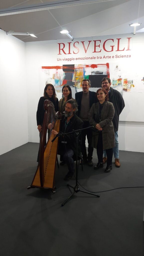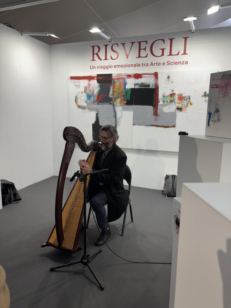 La performance di sabato 22 novembre ha visto intrecciarsi in modo tangibile Arte e Scienza. Durante l’esecuzione sonora dal vivo con arpa e armonica a bocca, i visitatori sono stati coinvolti in un esperimento scientifico condotto dal dottor Augusto Fusco, Responsabile UOSD Neuroriabilitazione ad Alta Intensità, Policlinico A. Gemelli IRCCS e dai collaboratori della struttura clinica.