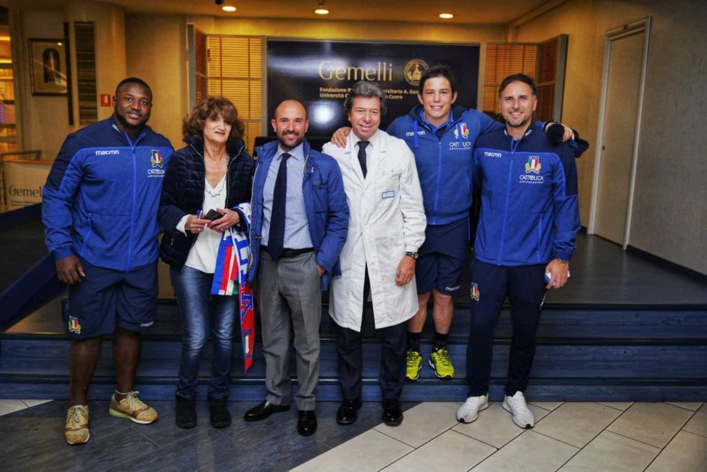 Gli atleti della nazionale Oliviero Fabiani e Cherif Traorè insieme ai dirigenti della Federazione Italiana Rugby sono stati accolti dal direttore medico Relazioni esterne ed Eventi della Fondazione Policlinico Universitario Agostino Gemelli IRCCS Dott. Giorgio Meneschincheri.