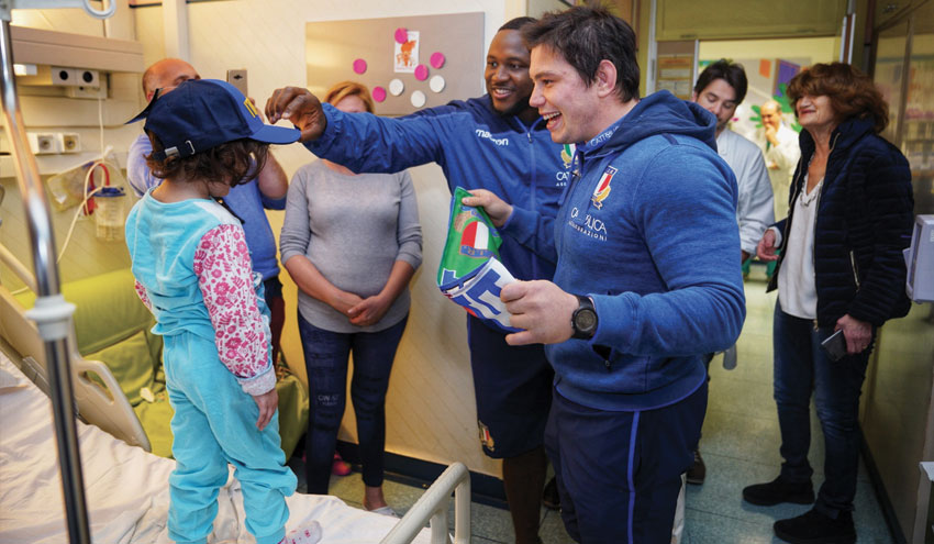 I nazionali del rugby, che sfideranno sabato 9 marzo l’Inghilterra al Twickenham Stadium di Londra, in questo ultimo giorno di Carnevale hanno portato doni e sorrisi ai piccoli ricoverati e alle loro famiglie, impegnati anch’essi nella loro “partita” per la guarigione.