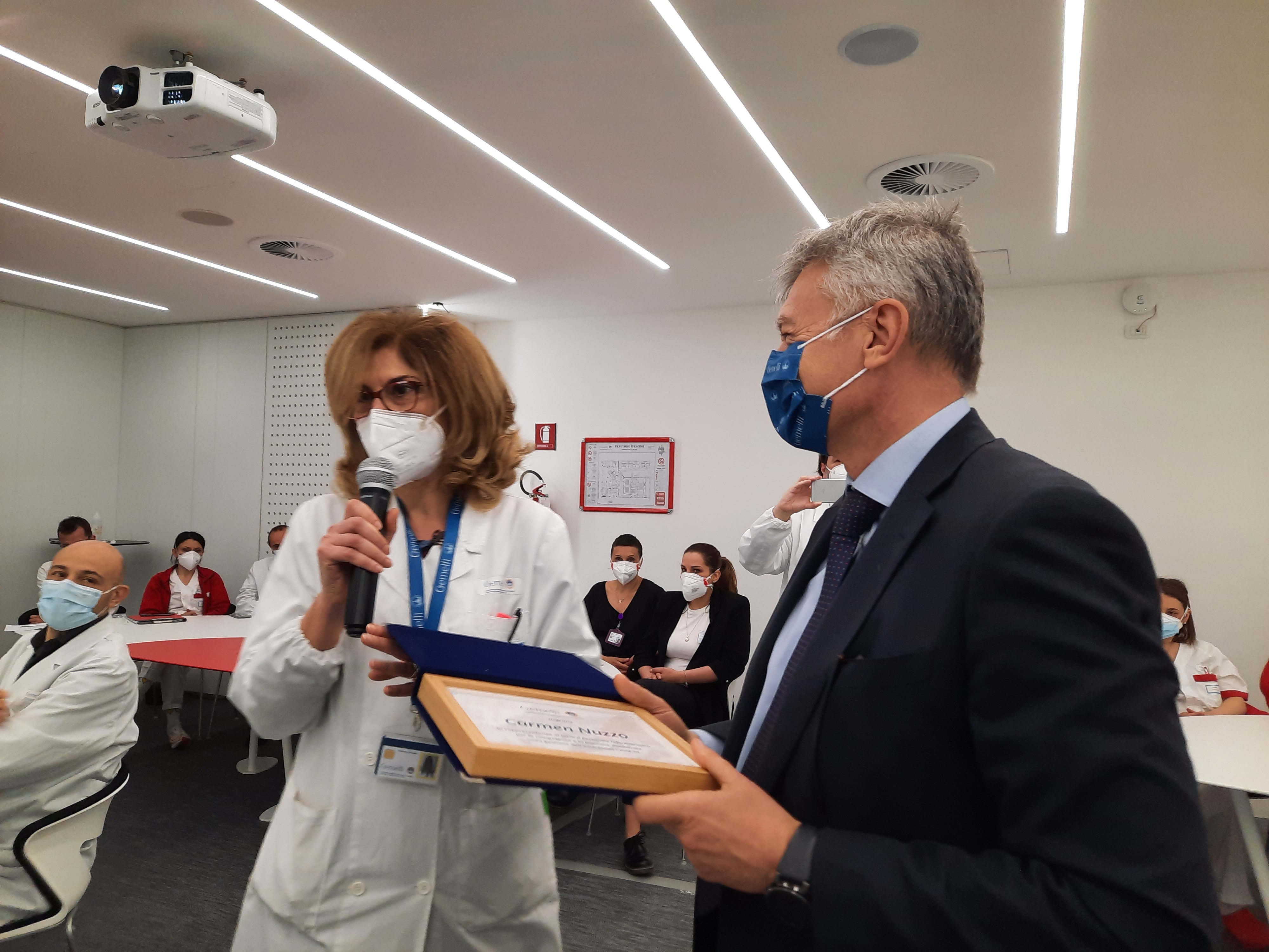 Il perimetro della gratitudine non si misura certo a parole. Ma un riconoscimento attribuito in occasione della Giornata ha un valore simbolico e uno spessore che vanno oltre le parole. Anche di quelle incise sulla targa consegnata oggi dal dottor Daniele Piacentini, Direttore delle Risorse Umane della Fondazione Policlinico Gemelli, alla dottoressa Carmen Nuzzo, responsabile SITRA del Columbus Covid-Hospital. Un segno tangibile di gratitudine, ma anche di rispetto e di grande apprezzamento per l’incredibile impegno profuso da tutto il personale infermieristico nell’anno del Covid-19, che ha spazzato via ogni concetto di collaudata routine, per lasciare il passo alle mille incognite dell’emergenza. “Ringrazio tutti – ha commentato la dottoressa Nuzzo – anche a nome di quei colleghi ora impegnanti ad assistere i pazienti più gravi in terapia intensiva. Negli anni del corso di laurea apprendemmo che l’operato degli infermieri deve essere improntato a una ‘scientificità creativa’. Questo approccio non è bastato quest’anno: abbiamo dovuto attingere a risorse che non immaginavamo di avere per affrontare le situazioni più estreme”.