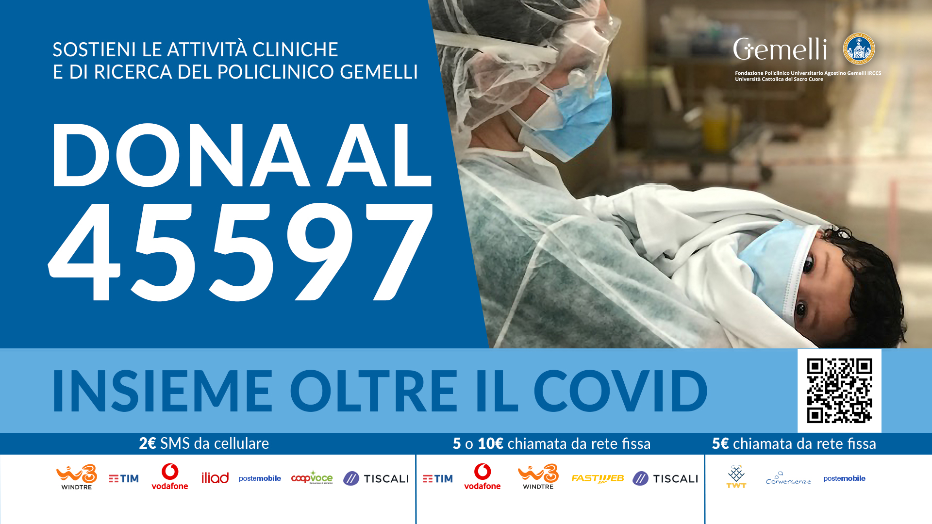 Fino al 27 ottobre sarà possibile sostenere i progetti della Fondazione Policlinico Universitario Agostino Gemelli IRCCS chiamando il 45597 da rete fissa TIM, Vodafone, Wind, Tre, Fastweb, Tiscali, TWT, Convergenze e PosteMobile per donare 5 o 10 euro; attraverso l’invio di un sms al numero 45597 per donare 2 euro da cellulare (Wind, Tre, TIM, Vodafone, Iliad, PosteMobile, Coop Voce e Tiscali); on-line con carta di credito sul sito policlinicogemelli.it.