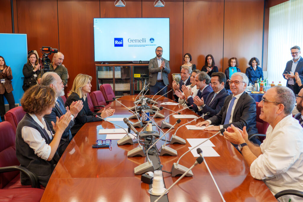 Sono intervenuti: Daniele Franco – Presidente Fondazione Policlinico Universitario A. Gemelli IRCCS; Giampaolo Rossi – Amministratore Delegato Rai; Simona Agnes – Consigliera di Amministrazione Rai; Daniele Piacentini – Direttore Generale Policlinico Universitario A. Gemelli IRCCS; Antonio Gasbarrini – Direttore Scientifico Policlinico Universitario A. Gemelli IRCCS, Elena Capparelli – Direttrice di Rai Play. Presente una rappresentanza di medici e personale sanitario delle aree e dei reparti del Policlinico Gemelli dove si è avviata la prima fase del progetto pilota: Cemad, Cemi, Giardino terapeutico, Pronto soccorso pediatrico, Gemelli Art.